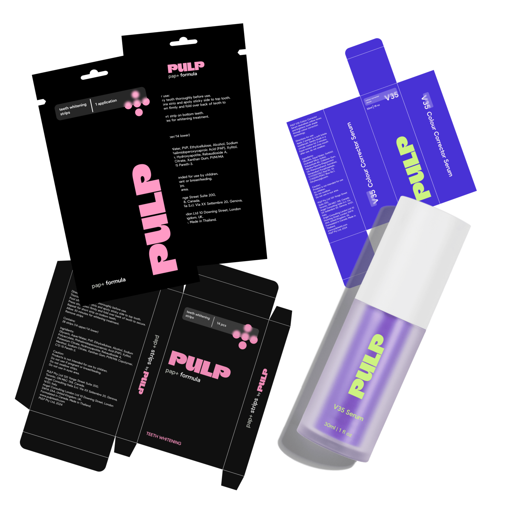 Сочетайте отбеливающий эффект PULP V34 с нашими отбеливающими полосками PULP PAP+ Whitening Strips, чтобы сделать улыбку белее в любое время и в любом месте!